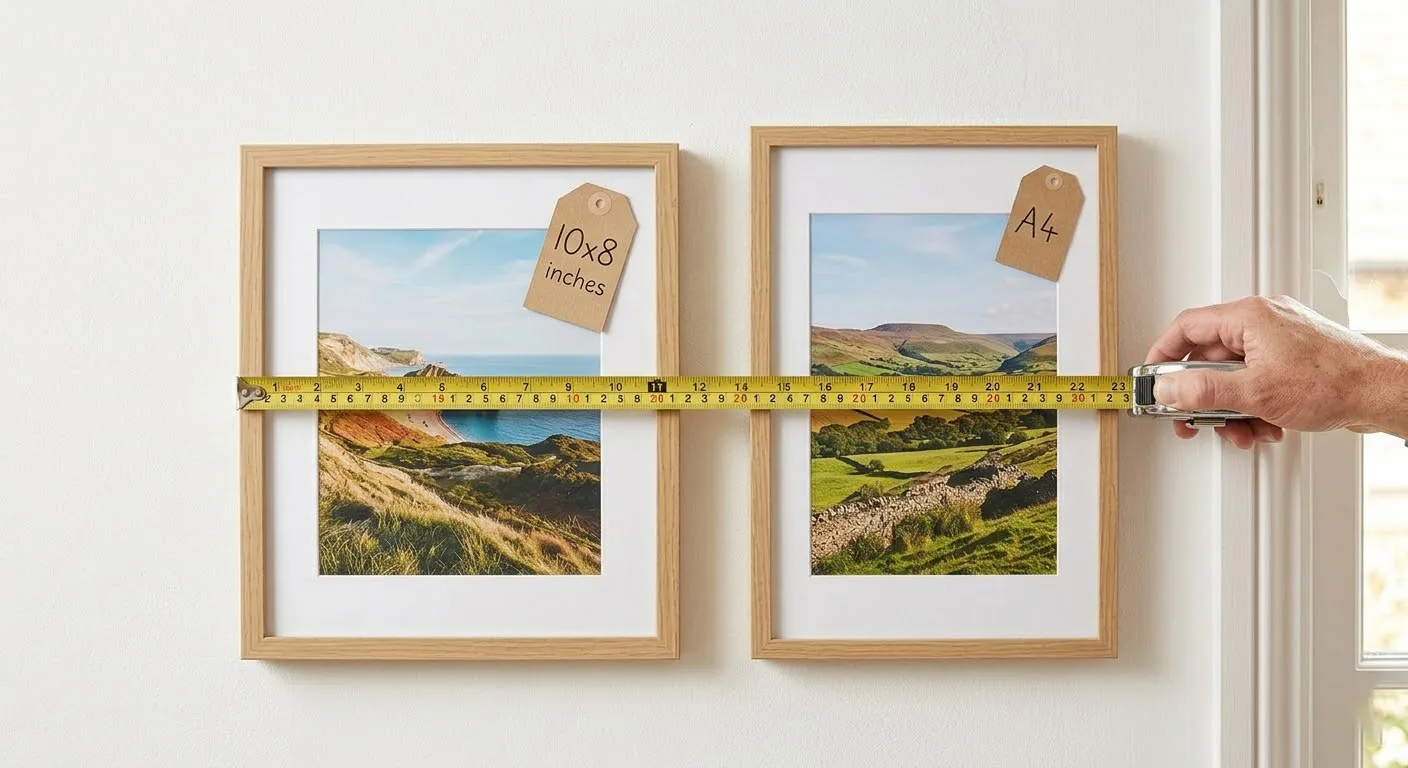When you see "A4 photo frames" in a shop, the frame's internal opening measures exactly 29.7×21 cm. But a "10×8 frame" measures 25.4×20.3 cm, which is close to A4 but not identical. Putting an A4 print into a 10×8 frame, or vice versa, leaves visible gaps or requires trimming. Always match like with like: imperial prints go in imperial frames, and A-series prints go in A-series frames.