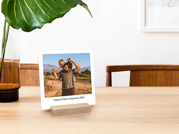 Putting your photos on display couldn’t be easier. Just choose a print and place it in the slot in the wooden photo holder. Your print will stand up by itself without needing extra support. You can replace the photo with a different choice anytime.